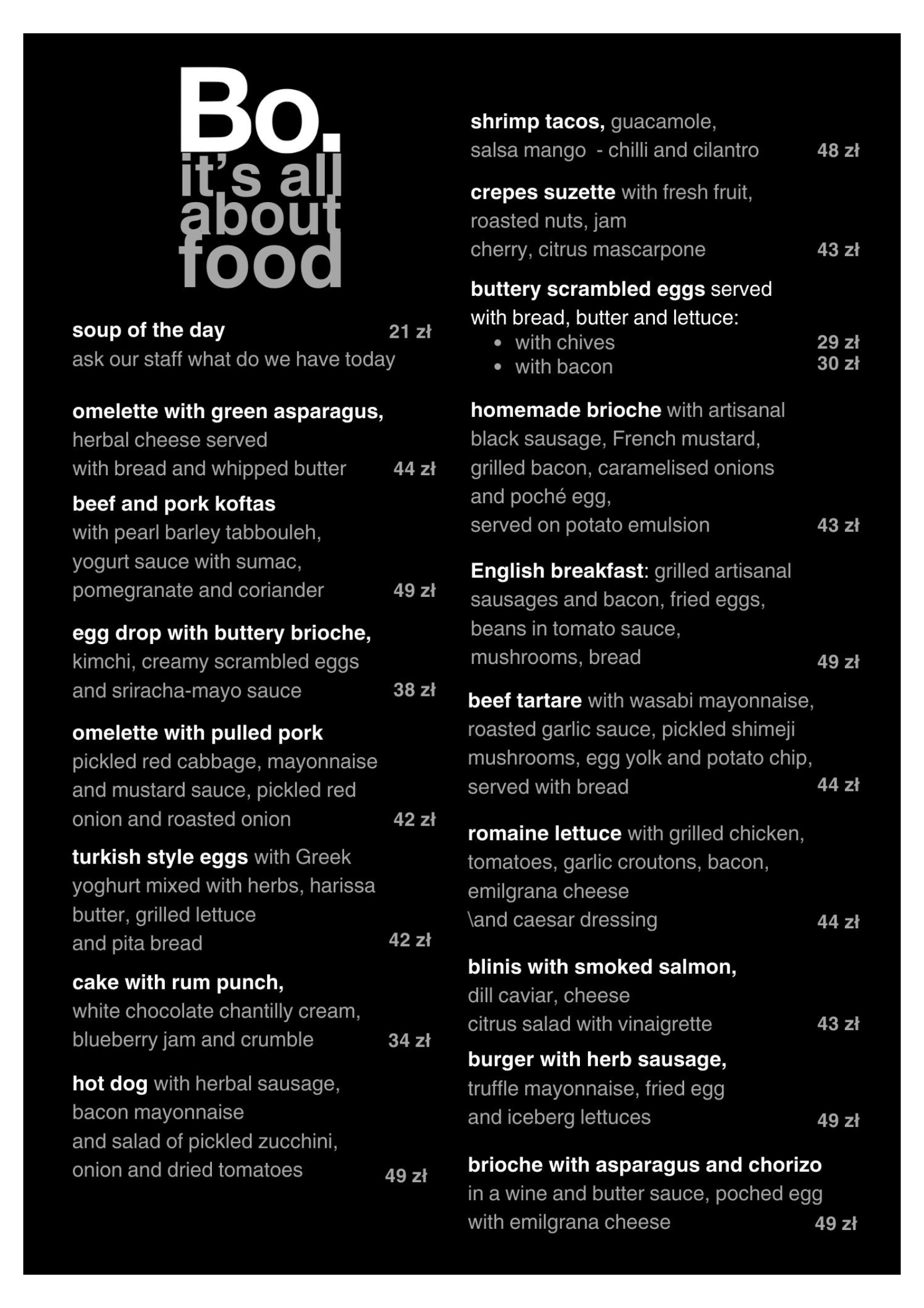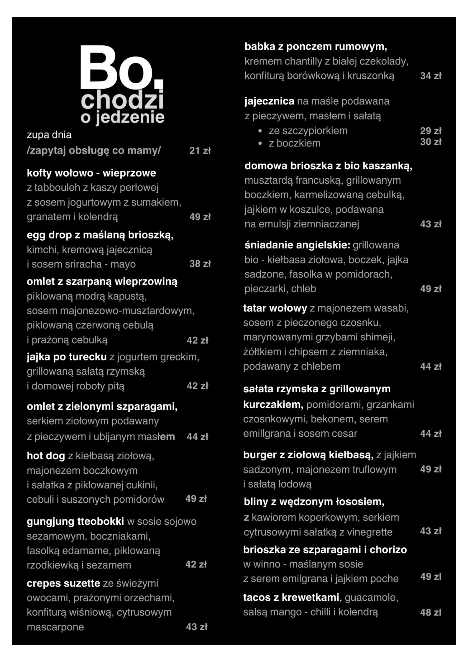 DOSKONAŁA Na podstawie 2896 opinii Opublikowano na Lejmanioszek xdTrustindex sprawdza, czy pierwotnym źródłem recenzji jest Google. super mila kelnerka i dobre jedzenieOpublikowano na Jakub SmolskiTrustindex sprawdza, czy pierwotnym źródłem recenzji jest Google. Restauracja Bo. w Poznaniu, zlokalizowana przy ul. Kościuszki 84, to idealne miejsce na pyszne śniadanie w centrum miasta. Oferuje różnorodne dania, od klasycznych po autorskie propozycje, przygotowane z sezonowych składników. Obsługa jest profesjonalna i przyjazna, a wnętrze przytulne i stylowe. To doskonały wybór na rozpoczęcie dnia w Poznaniu.Opublikowano na Radek MiTrustindex sprawdza, czy pierwotnym źródłem recenzji jest Google. Zestaw podstawowy, kawa + ciacho. Oryginalna kafejka w samym centrum miasta. Dogodne miejsce parkowania jeśli przyjedziesz motocyklem lub rowerem.Opublikowano na Tomasz STrustindex sprawdza, czy pierwotnym źródłem recenzji jest Google. Przesympatyczna ekipa, nieszablonowe i pyszne jedzenie 🥰 Nie wstawię zdjęcia dania - zobacz i spróbuj sam - warto 💕Opublikowano na Yunus HaznedarTrustindex sprawdza, czy pierwotnym źródłem recenzji jest Google. As stan twitter once said “Hmm, the flavor… oh my god it is so real.” Gorąco polecam! Super atmosfera, przepyszne śniadanko. Mega dziękuję! 🤩